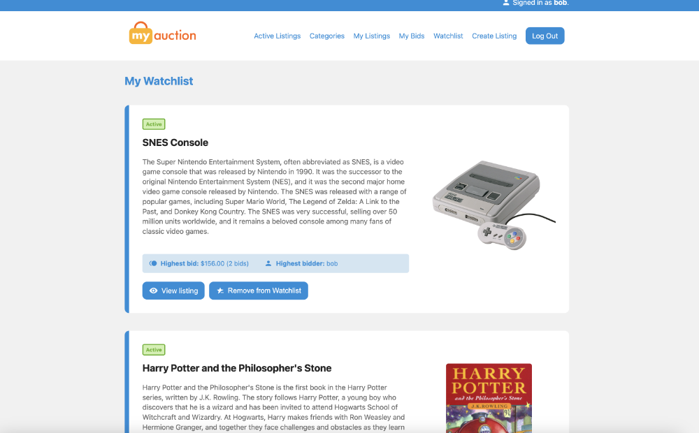 Full-stack responsive auction site written in Python/Django with user accounts, bidding, comment section, categories and watchlists. This project was part of Harvard X's CS50W course. Python/Djangoで書かれた、ユーザーアカウント、入札、コメント欄、カテゴリー、ウォッチリストを備えたフルスタックのレスポンシブオークションサイトです。このプロジェクトは、Harvard XのCS50Wコースの一部でした。