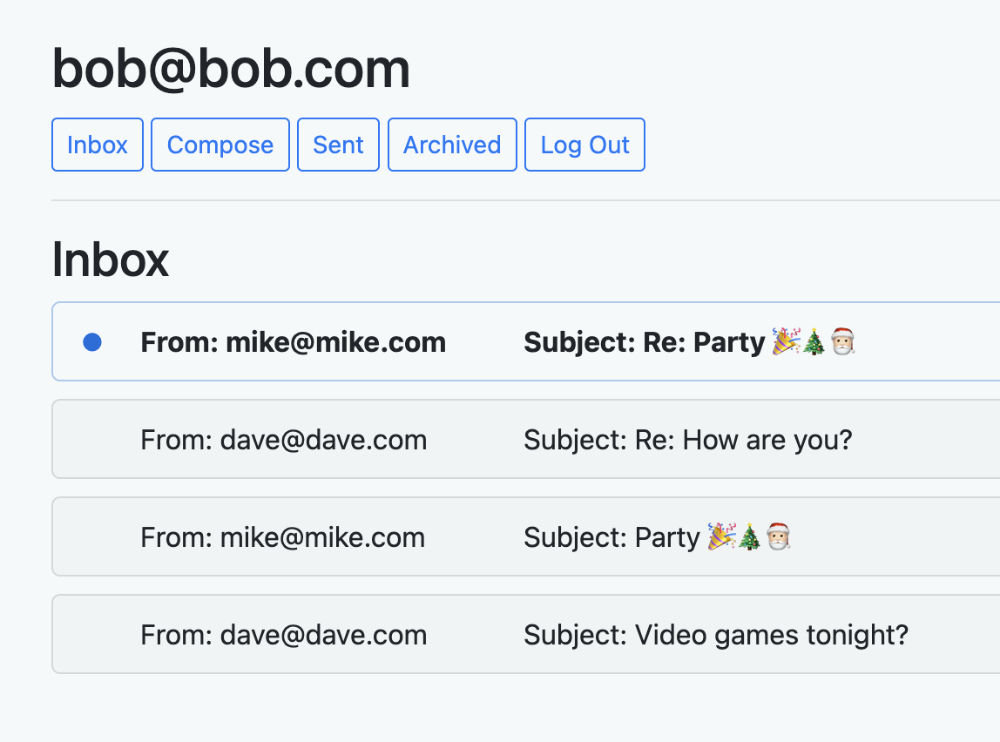 Simple one-page mail web app that lets you send, receive and archive emails. It uses JavaScript's Fetch API to request and post data in JSON format via an API on the server. This project was part of Harvard X's CS50W course. メールの送受信とアーカイブができる、シンプルな1ページメールWebアプリです。JavaScriptのFetch APIを使って、サーバー上のAPI経由でJSON形式のデータをリクエストし、ポストしています。このプロジェクトは、Harvard XのCS50Wコースの一部でした。