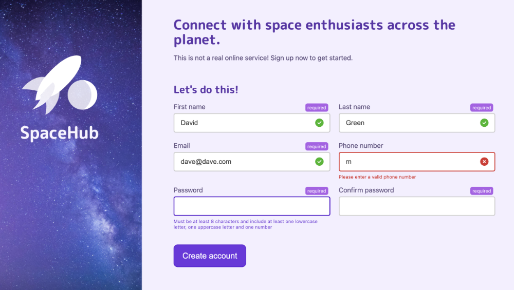 Responsive sign-up form with delayed JavaScript validation that follows the best-practice of waiting to warn the user of errors until they have moved to the next input field. レスポンシブなサインアップフォーム。JavaScriptの遅延検証により、ユーザーが次の入力フィールドに移るまでエラーの警告を待つというベストプラクティスに沿っています。